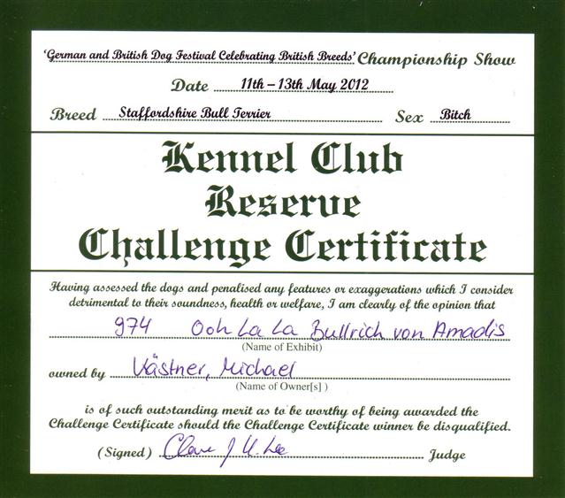 Staffordshire Bullterrier CH Ooh La La Bullrich von Amadis DOB: 10.02.2010 Pedigree |