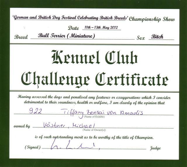 Miniatur Bullterrier Tiffany Bonsai von Amadis DOB: 20.12.2010 Pedigree Bundesjugendsieger 2011 Clubsieger GBF & Österreich 2012 Vize-Weltjugendsieger 1 UK CC |